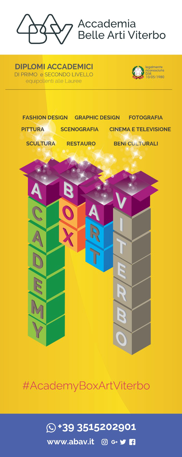 Academy Box Art Viterbo è uno spazio espositivo gestito dalla prestigiosa Accademia di Belle Arti viterbese che ospiterà mostre personali, appuntamenti con protagonisti del mondo della cultura e dell’accademia, vernissage con focus tematici e l’esposizione delle migliori opere degli studenti dell’Accademia. Un ciclo di mostra ed una serie di eventi aperti al pubblico in cui gli ospiti potranno finalmente tornare a respirare aria di arte, cultura e partecipazione. All’inaugurazione confermata la presenza del Sindaco di Viterbo Giovanni Arena insieme ad altre figure di rilievo istituzionale ed accademico.